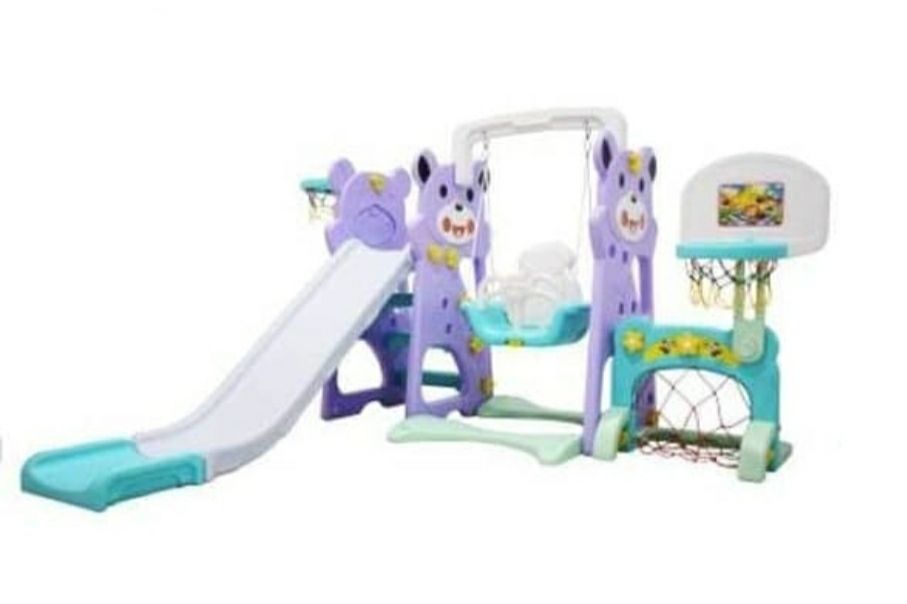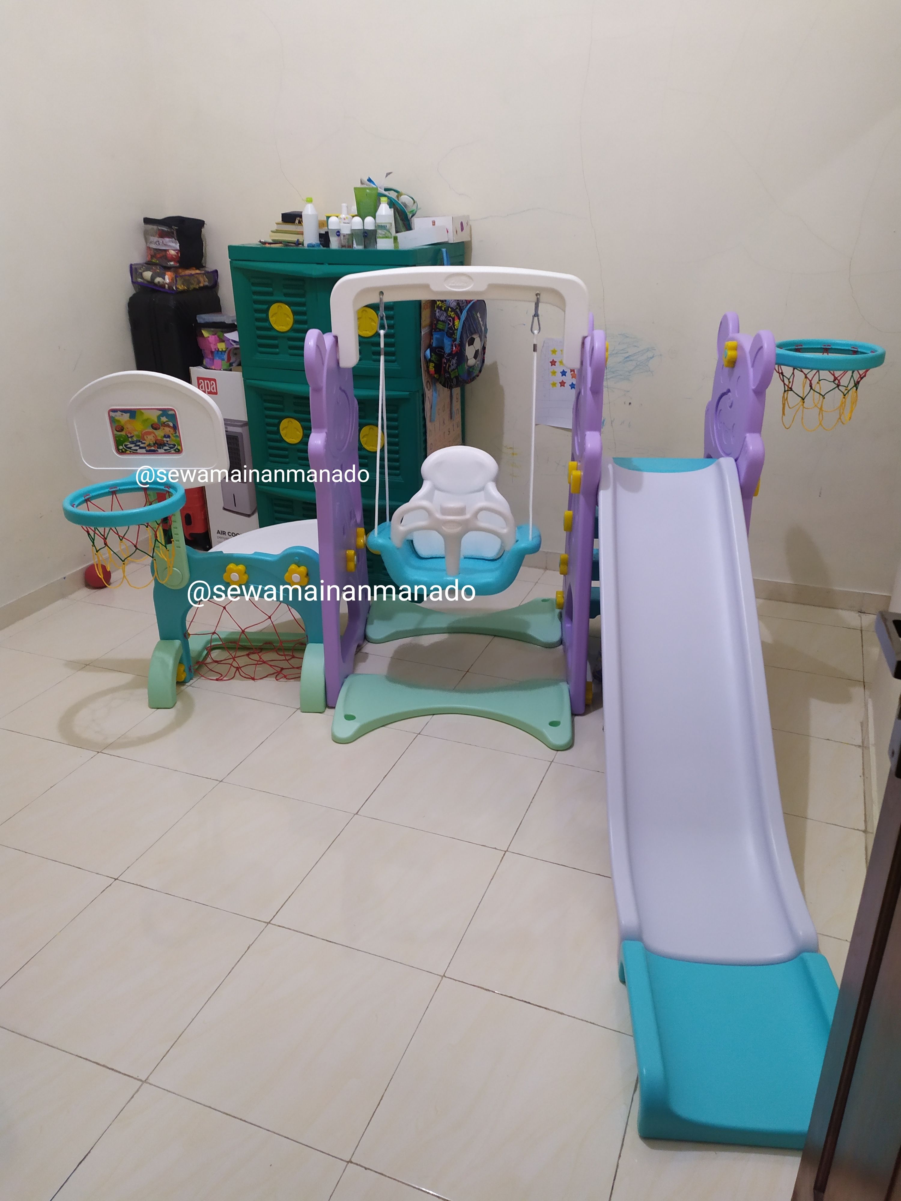 Mainan perosotan dan ayunan lengkap dengan sarana olahraga menciptakan waktu bermain lebih menyenangkan. Dilengkapi 2x ring basket, tiang basket mini yang dapat disesuaikan ketinggiannya, gawang sepak bola dan meja. Bola basket, bola kaki dan pompa angin sudah termasuk dalam paket.