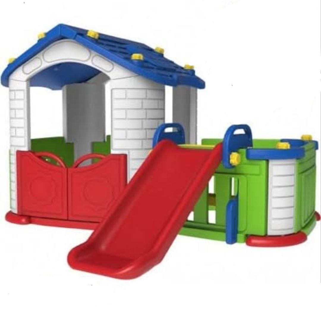 Tobebe - Big Happy Playhouse with slide merupakan rumah-rumahan yang dilengkapi dengan pagar pengaman dan perosotan.
