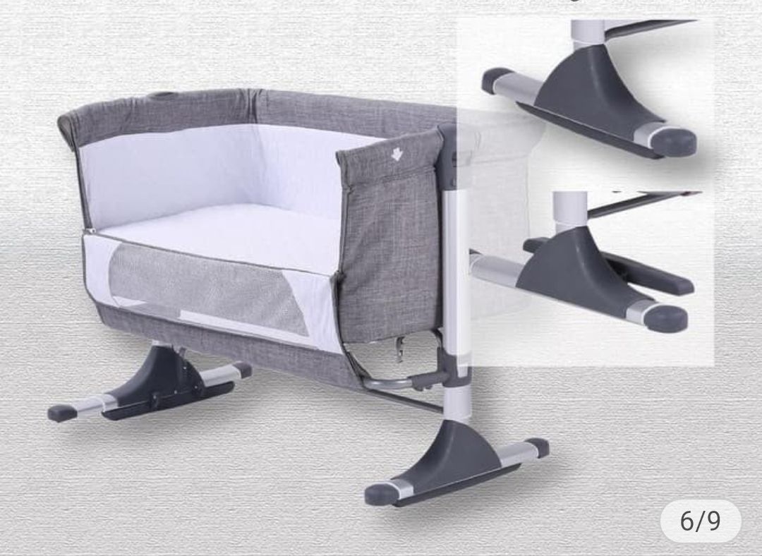 Satu sisi dapat diturunkan sehingga dapat sejajar dengan tempat tidur orangtua .