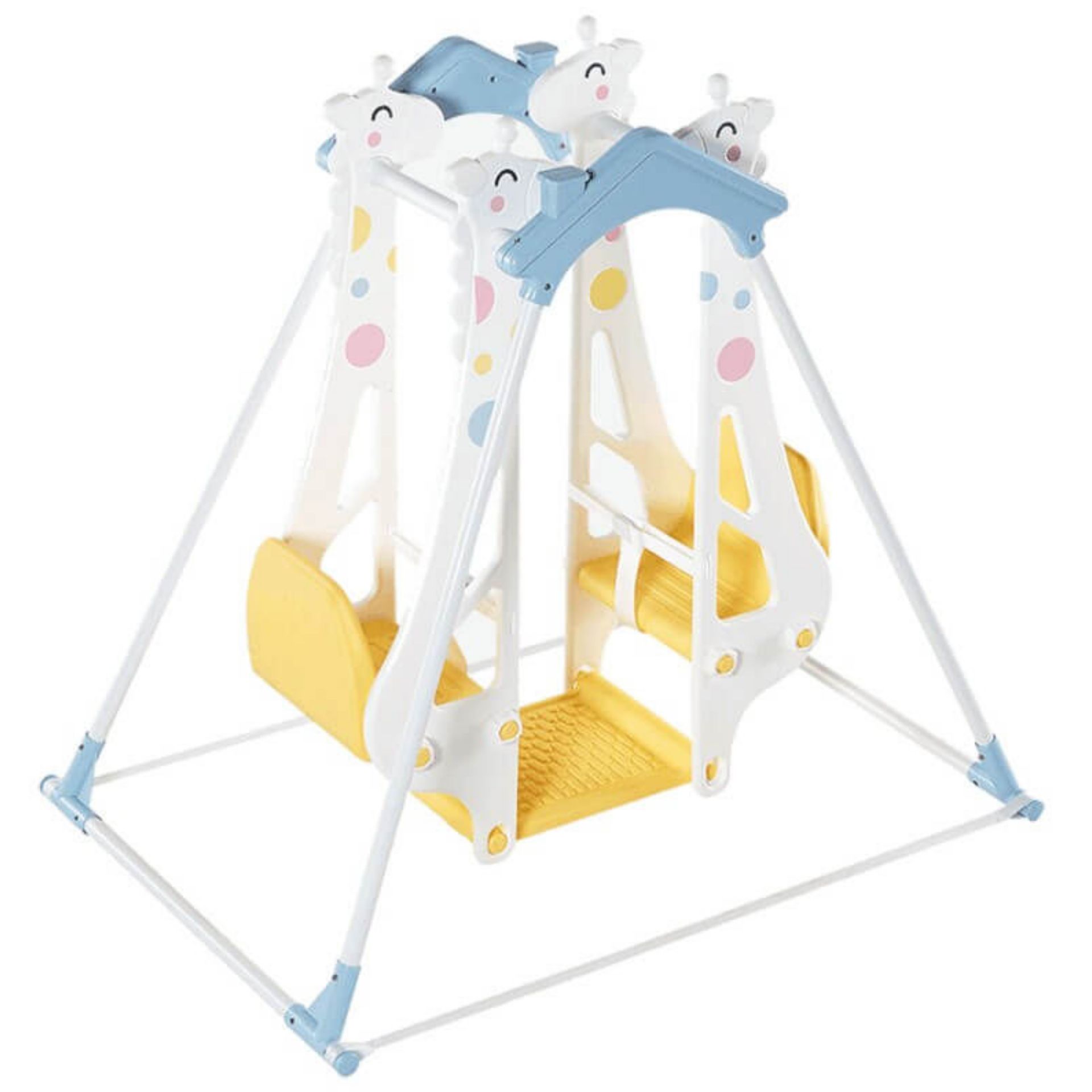 Haenim Popo Double Swing adalah mainan ayunan seru untuk anak-anak bermain, ukuran yang kompak sehingga dapat ditaruh dimana saja. Hadir dengan desain jerapah yang lucu dengan warna cerah disukai anak-anak. Ayunan terdiri atas dua kursi ayunan, dapat digunakan oleh 1 2 anak sekaligus, dengan total berat anak maksimal 40kg. Ayunan dilengkapi safety belt dan juga pijakan kaki, agar anak-anak aman dan nyaman bermain ayunan. Fitur: - Desain ayunan jerapah lucu. - Bahan rangka dari besi dan plastik berkualitas lebih kokoh. - Tali pengaman dan pijakan kaki bermain lebih aman dan nyaman. - Dapat digunakan oleh 1-2 anak. - Mudah dalam perakitan. Dimensi Produk: P 126,5cm x L 87,5cm x T 120cm Anak Usia: 1 - 5 Tahun (Maks 40kg)