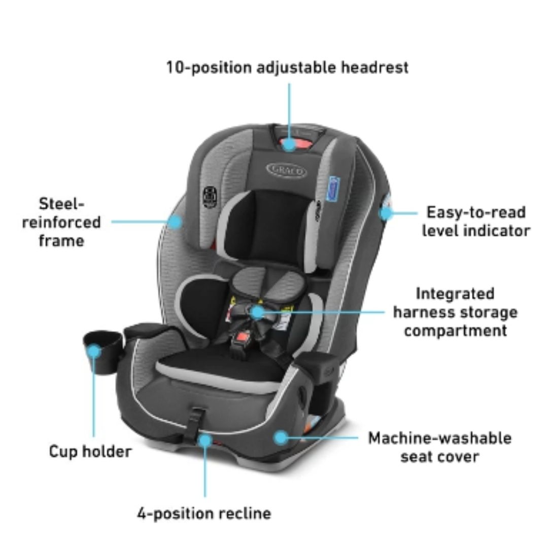 Car Seat tumbuh bersama anak Anda. Ini tiga kursi dalam satu, untuk kenyamanan di setiap panggung. Kursi mobil 3-in-1 ini dapat diubah dari harnes hadap belakang (5-40 lb) menjadi harnes hadap depan (22-65 lb) menjadi highback booster (40-100 lb). Berkat Sistem Harness Simply Safe Adjust™ no-rethread, harness dan sandaran kepala menyesuaikan bersama dalam satu gerakan, untuk memastikan bahwa anak Anda selalu terlindungi dengan baik. Sandaran 4 posisi membuat anak Anda nyaman, sementara sistem LATCH InRight™ memudahkan pemasangan dengan pemasangan satu detik. Kursinya adalah Graco® ProtectPlus Engineered™ untuk membantu melindungi si kecil dari benturan depan, samping, belakang, dan terguling.