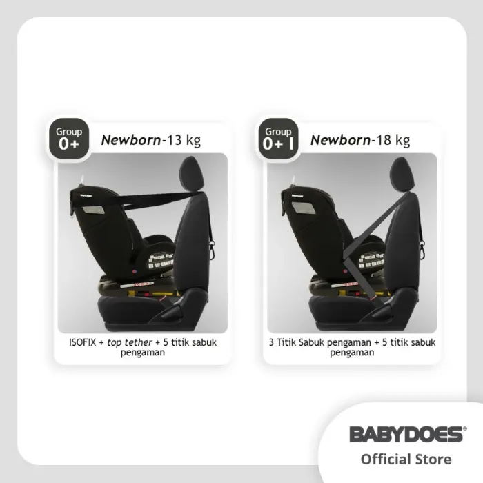 ✅ Group 0+ (newborn-13 kg) / menghadap belakang: ISOFIX + top tether + 5 titik sabuk pengaman