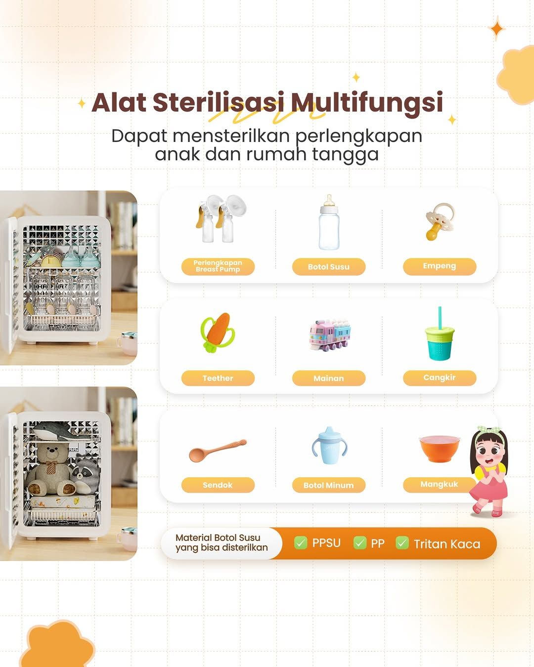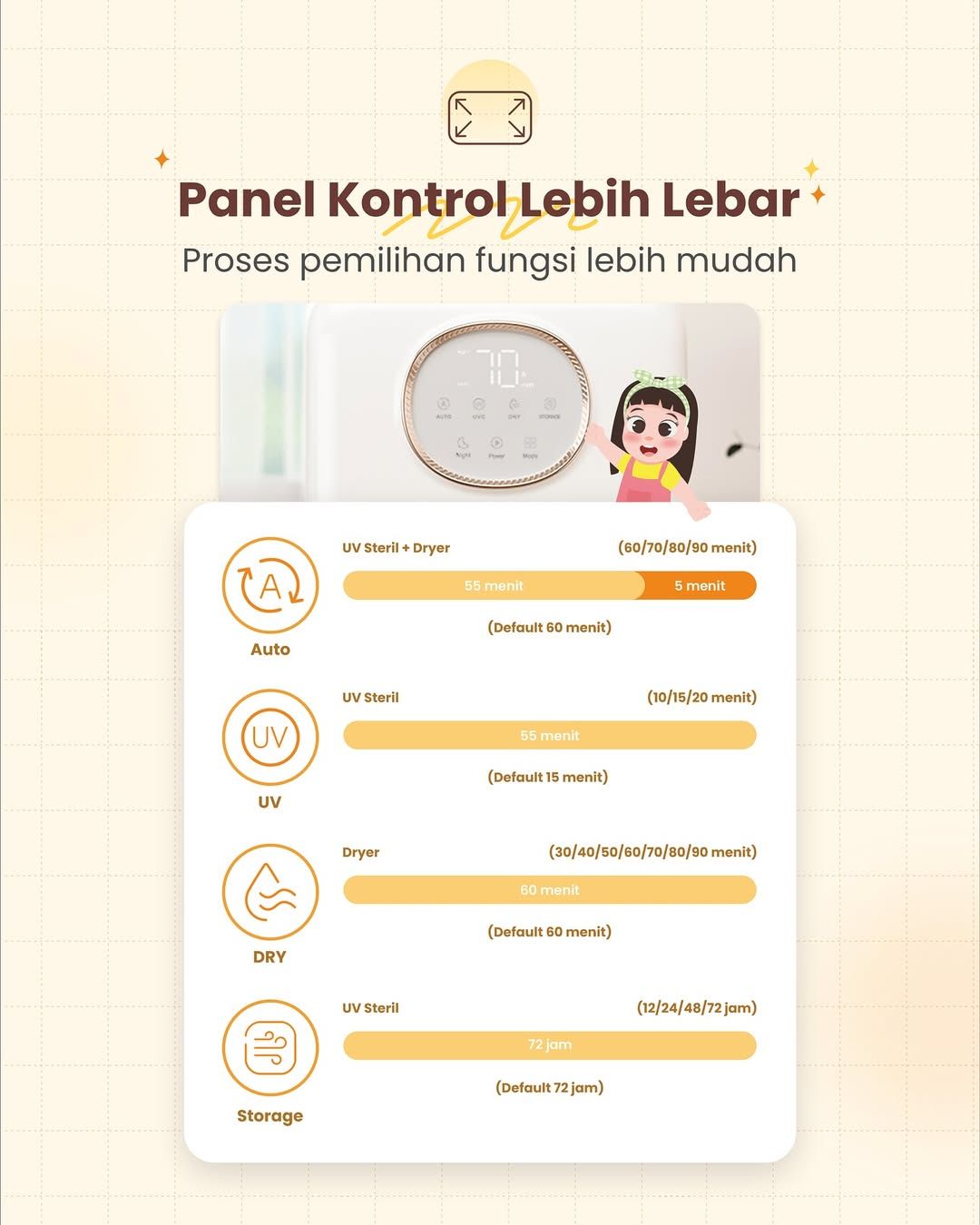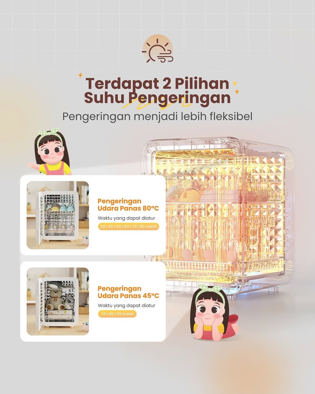 Dilengkapi pula dengan pengeringan panas dengan 2 mode pilihan suhu: 80°C & 45°C, sehingga pengeringan lebih fleksibel serta dapat mencegah pertumbuhan kuman & bakteri pada perlengkapan si Kecil✨