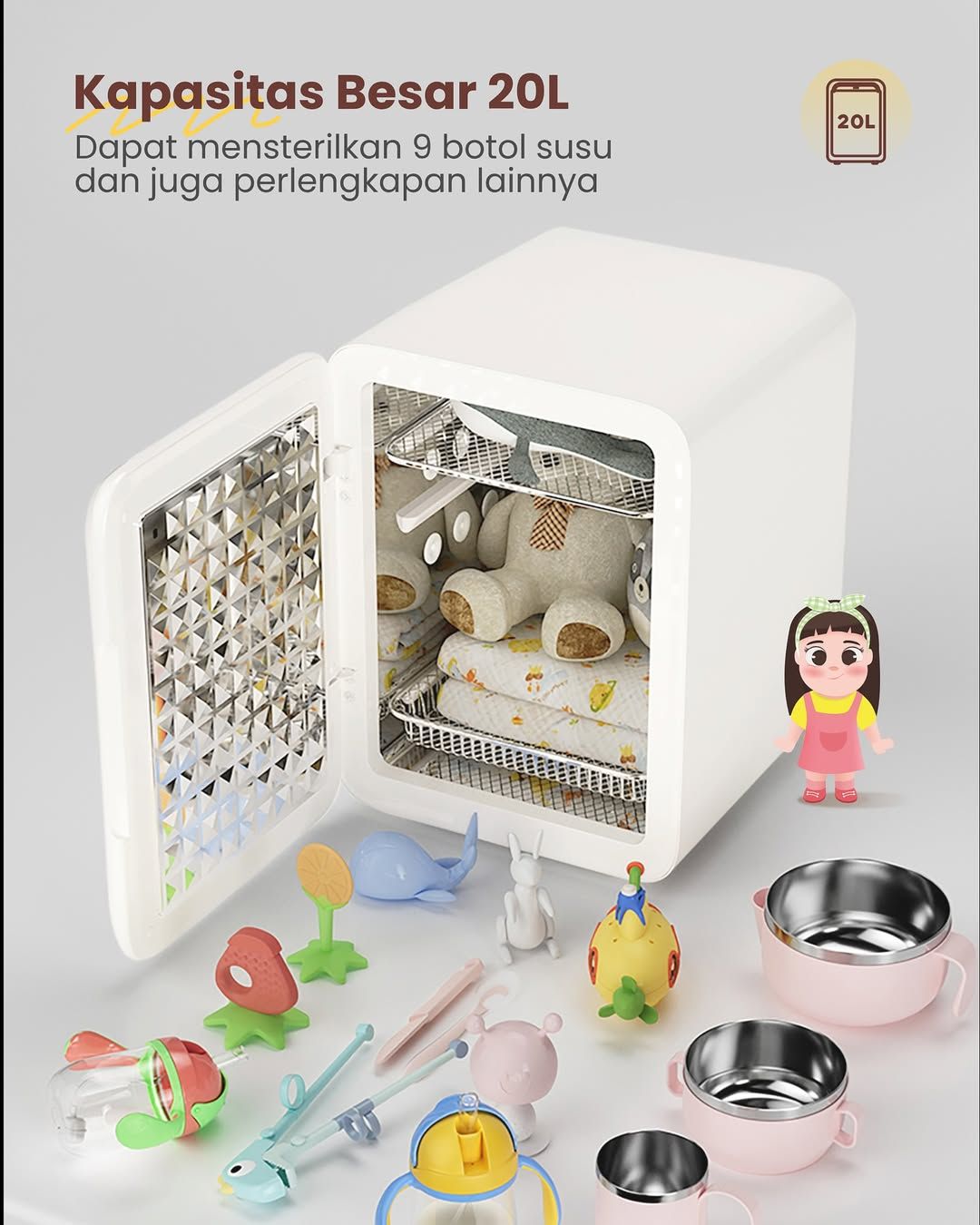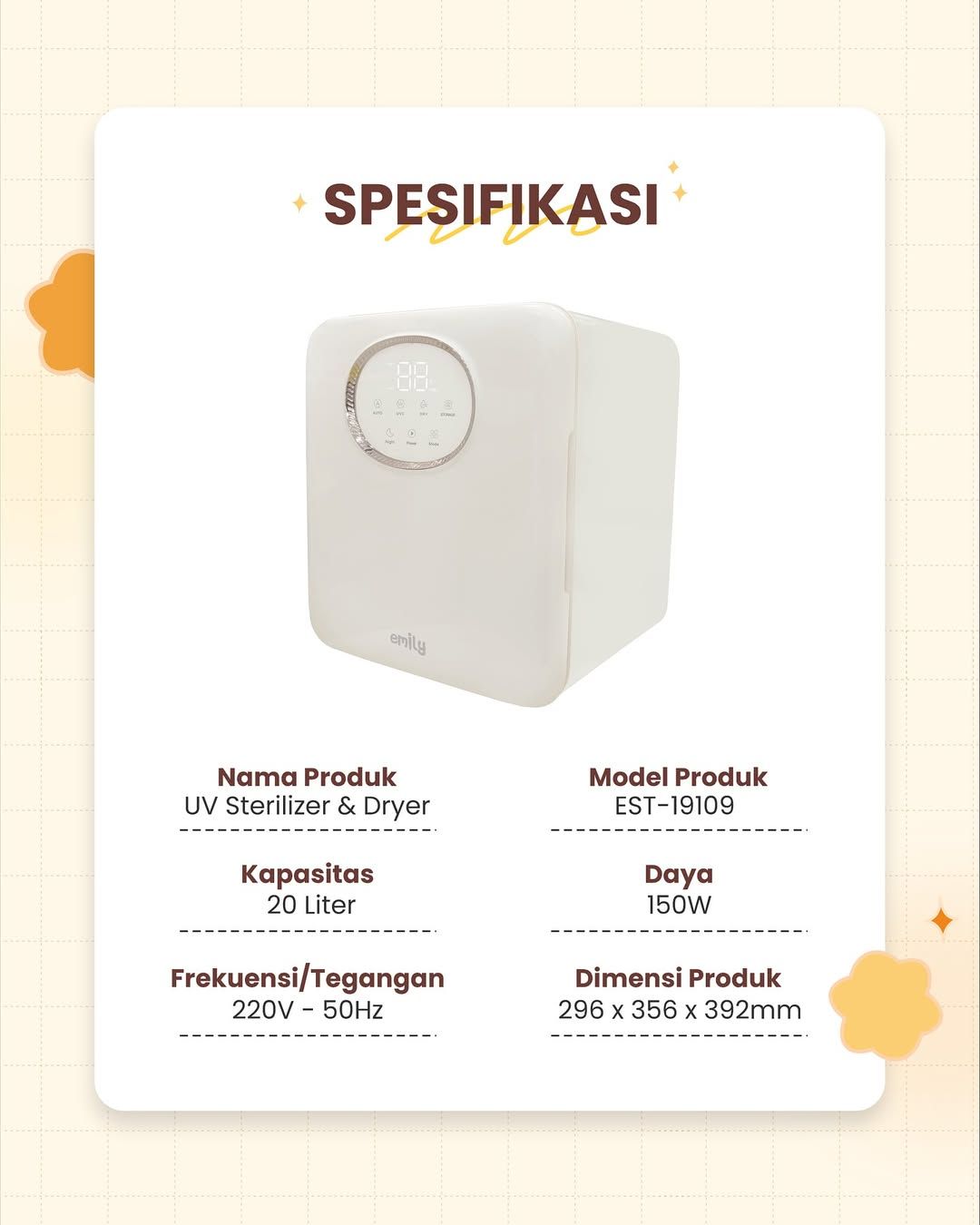 Dengan kapastitas 20L, Emily UV Sterilizer & Dryer ini dapat menampung hingga 9 set botol susu dalam 1 kali siklus pemakaian.