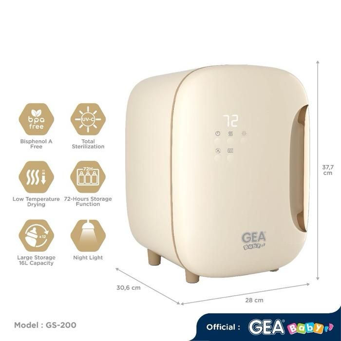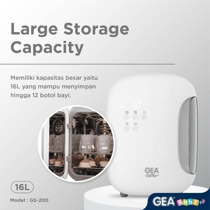 Gea baby Smart LED UV Sterilizer & Dryer GS-200 merupakan produk untuk mensterilkan sekaligus mengeringkan dan menyimpan barang agar terhindar dari bakteri, kuman, dan virus.